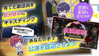 تتميز اللعبة بفريق متنوع من أعضاء المسرح الوسيمين، بدءًا من طلاب المدارس المتوسطة وحتى البالغين. يمكن للعبة تدريب وتنمية هؤلاء الشخصيات، مساعدتهم في النمو وتحسين مهاراتهم. يسمح عملية الإلقاء للاعبين باختيار الأدوار والأزياء لشخصياتهم، مما يمنحهم السيطرة الكاملة على الإنتاجات.
